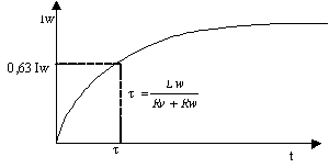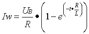 Die Steuerlogik steuert über einen elektronischen Schalter den Strom durch die Motorwicklung des Schrittmotors. Nach dem schliessen des Schalters steigt der Strom entsprechend der Zeitkonstante Lw/(Rw+Rv) auf allmählich auf seinen Endwert an. Der Strom wird durch die beiden Widerstände R=Rw+Rv begrenzt und der angelegten Betriebsspannung. Der Strom durch den Motor steigt nach folgender Formel an: |