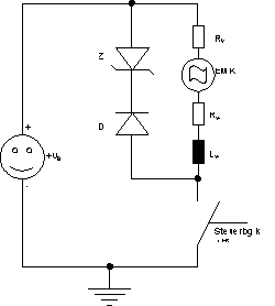 Dabei steigt der Strom durch die Motorwicklung nach obiger e-Funktion an. Nach dem Abschalten des Schalters durch die Steuerlogik baut sich die in der Motorinduktivität gespeicherte Energie über die Freilaufdioden (Z und D) mit derselben Zeitkonstante wieder ab.