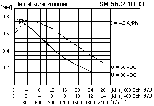 In obigen Motorkennlinien ist das Motordrehmoment [Nm] über der Motorfrequenz (Drehzahl) dargestellt. Die obere gestrichelte Kennlinie zeigt eine Ansteuerung mit 60V, die durchgezogene mit 30V Ansteuerspannung. Im unteren Drehzahlbereich gibt es keine wesentlichen Unterschiede, jedoch mit steigender Motordrehzahl macht sich die höhere Ansteuerspannung positiv auf das Motordrehmoment bemerkbar.